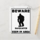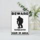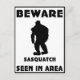 Black & white beware sign, warning trespassers that a Sasquatch has been seen in this area. Phrase states, “Beware” on the top of the poster in large black font with a black sasquatch silhouette in the center & words, “Seen In Area,” written at the bottom of the sign.