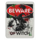 Fun sign "Beware of Witch" with a witch, blood, and green and black matter splatters.