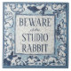 "Beware of the Studio Rabbit" reads this tile sign or trivet. Any bunny rabbit lover will appreciate this! My hand painted blue and white tile design looks like old crackled Delft tile, and the border & bunnies are reminiscent of old Dedham pottery motifs. Original art & design by Tuzi Williams.