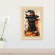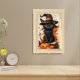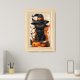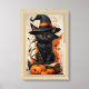 A cute, black kitten dressed as a witch, complete with a pointed hat and a wand. The kitten is surrounded by pumpkins and bats, creating a festive and spooky Halloween atmosphere.