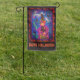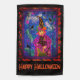 Dress up your lawn or garden this Halloween with this colorful fun garden flag. On the front a sassy red headed witch holds her black cat on a mysterious Halloween night, three mischievous crows caw in the dead trees, while two ghosts and lots of bats fly through the spooky sky! On the back a flock of black bats against an orange background continue the Halloween theme.
