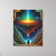 A futuristic, fantasy image generated using stable diffusion ai art. A figure standing on a platform at the entrance of a huge opening in a mountain range. An interesting prism shape carved with a variety of patterns hovers in front of the entrance. A bright light that seems to be supplying energy to the prism. An ancient tribal image of a face is carved into the prism. Prismatic colours illuminate from the top of the prism. A different dimension may be entered into.
