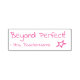 This positive rubber stamp design features the inspirational message "Beyond Perfect!" and a customized educator's name. It could be used by a teacher, educator, instructor, or tutor when marking assignments, to indicate that the student has done well.