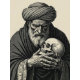 A haunting portrait of a weathered figure, Beyrevra, cradling a silent second face, blending mystery, identity, and quiet intensity through intricate engraving lines and dramatic contrast. Beyrevra is a demon of the souls that roam through space.