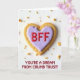 This cute greeting card shows a heart-shaped cookie centered on a plain white background. The cookie is golden-brown with a slightly rough, baked texture, and a few small crumbs are scattered around it. In the middle, there’s a smooth lavender icing heart that matches the cookie’s shape. On top of the icing, the letters “BFF” appear in shiny, raised red candy, standing out clearly. Below the cookie, the card reads “YOU’RE A DREAM FROM CRUMB TRUST!” in simple block-style lettering that’s easy to spot near the bottom. The bright lighting keeps everything clear and cheerful, giving the cookie a sweet, fresh look ❤️💌🍫.