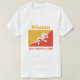 An editable title and slogan accompanies the white dragon over yellow and orange triangles of the Bhutanese flag on the front of this t-shirt. The back displays a detailed map of Bhutan.