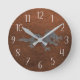 Bhutanese dragon graphic in grey with brown leather texture background and white numbers clock face