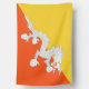 This design features the national flag of Bhutan (officially known as the Kingdom of Bhutan), which is a landlocked country in the Eastern Himalayas in South Asia. Bhutan is bordered by the Tibet Autonomous Region of China to the north and India to the south. The capital city of Bhutan is Thimphu, which is also the country's largest city. Phuntsholing (also spelled as Phuentsholing) is the financial center of Bhutan. Other major cities or towns in Bhutan include Paro, Gelephu (also spelled as Gelyephug), Samdrup Jongkhar, Wangdue Phodrang, Punakha, Jakar (officially known as Bumthang), Nganglam (also spelled as Namglam) and Samtse. The national flag of Bhutan features a "Thunder Dragon" (Druk), which is a traditional creature from Bhutanese mythology.
