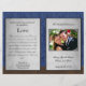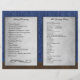 Bi Fold Denim Western Wedding Ceremony Programs--customize these wedding programs with a photo of the soon to be bride & groom. Your guests will have a keepsake from your wedding ceremony. All you have to do is fold them in half. The design features a printed denim background with silver-gray vintage text boxes in a parchment paper-like design. The bottom of both the inside & outside also features a printed brown leather band for added decor. The back features the famous Biblical quote, "Love is Patient" in stylish text. The inside features a swirl design at the bottom of the "Order of Ceremony" that you can remove if more room is needed in the text box area. See tips for customizing below.