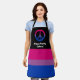 Medium-sized apron with an image of a bisexuality pride flag and a peace symbol; pink or magenta, purple and blue design on a black background, with a customizable text template for your own name or message