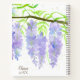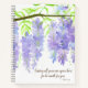 A custom name personalized notebook decorated with a wisteria tree in full bloom illustrated with watercolor and accented with watercolor spatter spots. On the front is an encouraging Bible verse from the book of 1 Peter 5:7. On the back is another view of the wisteria tree branch and an area where you can customize your name and the year. Lovely baptism gift
