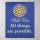 Bible Verse With God All things Possible Christian Poster. Midnight blue background with light yellow text and floral accent. Inspirational, motivational christian message.