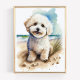 Cute Bichon Frise dog on the beach artwork in watercolor.