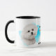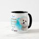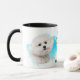 A portrait of an adorable white Bichon Frise dog is the feature on two sides of this mug. Each image is placed on a bright blue splatter background. Between the two images is the text that describes this loyal and loving companion, with "the BICHON FRISE" in black at the bottom. All the text is easily customized to anything you'd prefer so that you may describe your own loyal friend.