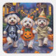 Adorable Bichon Frises dressed in playful Halloween costumes carry pumpkin buckets while trick-or-treating under the moonlit sky. This festive design highlights the breed’s fluffy white coat, cheerful spirit, and affectionate personality, perfectly capturing the spooky yet fun atmosphere of Halloween night. A charming celebration for dog lovers and Halloween fans alike.