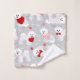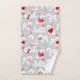 Cute Valentine's Day Bichon Frise dogs wearing red, pink, and white polka dot and heart sweaters with scattered paw prints and arrow on a gray background.