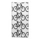 This set of decorative napkins features a contemporary design of an abstract pattern of repeating black bicycles on a white background.