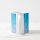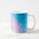 Here is a unique and pretty personalized coffee mug that features a slate blue silhouette image of a girl riding a bicycle. The image is placed on a colorful abstract background in tones of blue, cerulean, lavender, and pink. The background looks like an abstract sunrise. Your triple monogram or other text is at the top in matching slate blue. The bicycle girl image is in the center, and the three letter monogram is printed on either side of it.