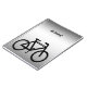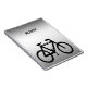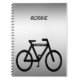 This notebook features a contemporary design of an abstract pattern of a black bicycle on a silver, gray and white metallic background. The name can be customized or removed.