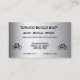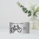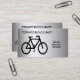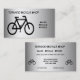 This business card advertises a bicycle shop specializing in sales, rentals and repairs. All text on front and back can be customized for your special business. It features a contemporary design of an abstract pattern of a black bicycle on a silver, gray and white metallic background.