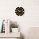 A bicycle wheel in bright orange and yellow colors is the inspiration for this striking design. The large wheel in the center has smaller wheels replacing some of the numbers around it, and it looks stunning on a black background. This is a modern clock that will appeal especially to the keen cyclist.