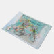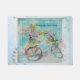 A beautiful spattered polychromatic water colored bicycle with flower baskets on blue burlap rimmed with white filigree, and with a greenish gray and white textured border around the blue burlap. Image credits: Pixabay.com – Image# 2416366, Image# 489879, Image# 2148492, Image# 1064162