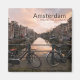 Souvenir photo magnet with some bicycles locked to the bar of a bridge over Prinsengracht canal lined by traditional canal houses at sunset in the city center of Amsterdam in the Netherlands with the text 'Amsterdam, The Netherlands'.