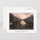 Postcard of some bicycles locked to the bar of a bridge over Prinsengracht canal lined by traditional canal houses at sunset in the city center of Amsterdam in the Netherlands with a white border and the text 'Amsterdam'.