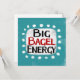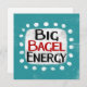 "Big Bagel Energy" is a cute text design in blue with black and red text, along with a white accent shape and white textured whimsical dots surrounding it.