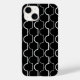 This phone case has an art deco design of white half circles connect with lines on a field of black.