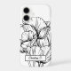 This phone case features an oversized line art drawing of tulips in black on a white background with and a personalized name. Original art from Dogwood & Thistle.