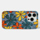 Bold yellow, orange and blue flowers on a groovy blue lined background.