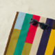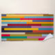 This beach towel has a geometric design of colorful stripes running vertically.
