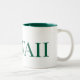 This is a large white coffee cup with a green inside and the word Hawaii written on it in green. It is a very beautiful and elegant city