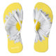 Pretty yellow and white flip flops, with a photo of a white and yellow daisy bloom split between both slippers. Personalize the white text, on the right foot to suit your needs.
