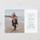 With a bold date in a light blue color and lots of space for custom text with all your wedding details, this save the date card also has a place for a single vertical engagement photo. The back is a coordinating beige cream color with stripes.