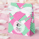 And she's off to the altar! Tent style party favor box with a white ribbon closure features a lady in her Derby hat on the front with your message against a background of hot pink, green and white diagonal blocks of stripes. Fun bridal shower boxes or change the wording and use for a birthday party or any occasion. 3" wide x 1.5" long x 3.25" high. MATCHING items in our store.