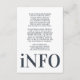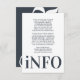 This ultra modern bold typography fantastic clean, tidy well designed minimal yet very playful bold info enclosure card is for any extra information for your events prior to the wedding ceremony, this information / details card & text placement in blue, grey and white for minimalistic style, however is customizable to other colors and is part of a unique suite and collection by Phrosne Ras Design. This would be great for those planning a fun black & white event, with this wedding enclosure card being bold and was inspired by fun-loving people who love a good party and don't mind straying from tradition.