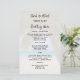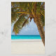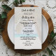 Big palm tree by the edge of the sea, beach wedding menu template. Clean and simple design with black text printed over a tropical scene. The same scene is printed in full color on the back of this affordable menu.
