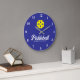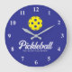 Big pickleball sports wall clock with custom text. Custom round time clock with yellow ball logo and script text. Fun Birthday party gift idea for fan, player, sports coach, dad, mom, wife, husband, teenager etc. Change ball logo and background into any color. Personalize with your own funny quote or club name. Available in different sizes. Great for office, kitchen, club house, bedroom, living room, restaurant, bar, cafe and other places.