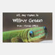 A colorful green gecko smiles at the camera on a large rectangular sticker. Fun for an eye-catching design on name badges for reunions, conventions or meetings. Delete the "Wilbur Green"/Text 2 area prior to purchase. Use a bright, light colored permanent marker to fill in the names of the people as they check in. The special occasion title or name of company can be pre-printed, using the template line shown here as "from Florida Office"