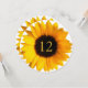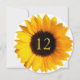 Chic table number card done in a round shape, with graphics of a big yellow sunflower covering the card, with the yellow number in the center. Personalize one card for each table at your reception. Use a clear plastic florist card pick, to attach to your table center pieces.