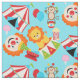 If you love the circus, bright colors, fun times, you'll love our Big Top Circus fabric featuring a sky blue background with the red, white, and blue striped big top tent, a lion, monkey juggling balls, popcorn, cotton candy, tickets, and clowns!