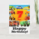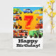 Nine bright colourful trucks surround a great big number 7! Add your own age! A green and yellow cement mixer, blue pick up truck, yellow bulldozer, orange dumper truck, red road roller, green tractor and trailer, big red firetruck, yellow digger and a builder's red truck! All kinds of transport, the big trucks that kids love! Perfect for your fire truck, digger, truck or tractor mad seven year old on his or her 7th Birthday. Wonderful for your 7 yr old's Truck Themed Birthday Party. Kids love Firetrucks, Trucks, Diggers and Tractors and seven year olds love them most of all! Truck Birthday Party Design and Illustrations Modern children's construction party and truck theme birthday party supplies, accessories, party favors and gifts. All designs and truck illustrations © Paul Stickland