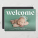 A sweet and elegant birth announcement design featuring a full bleed horizontal or landscape oriented photo with "welcome" overlaid at the top in white retro block lettering. Your baby's name and birth stats appear along the bottom. Add three additional square photos to the back, along with a personal message.