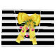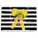 Stylish gift bag done in a bold black and white horizontal stripe pattern. Graphic artwork of a big yellow satin looking bow, with pink berries hanging down, decorates the middle front and back of the bag. Personalize the text, on the front, to read what you want.