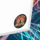 Bigfoot is looking happy as he walks along. This is a retro sunrise design in yellow, orange and red and looks great on a black or dark background.