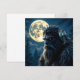 Bigfoot card. A Sasquatch with golden glowing eyes with an owl on his shoulder with a Full Moon forest background in shades of blue.