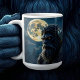 Bigfoot coffee mug. A Sasquatch with golden glowing eyes with an owl on his shoulder with a Full Moon forest background in shades of blue.