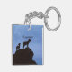 A watercolor painting of bighorn sheep silhouetted on a cliff adorns this customizable keychain!